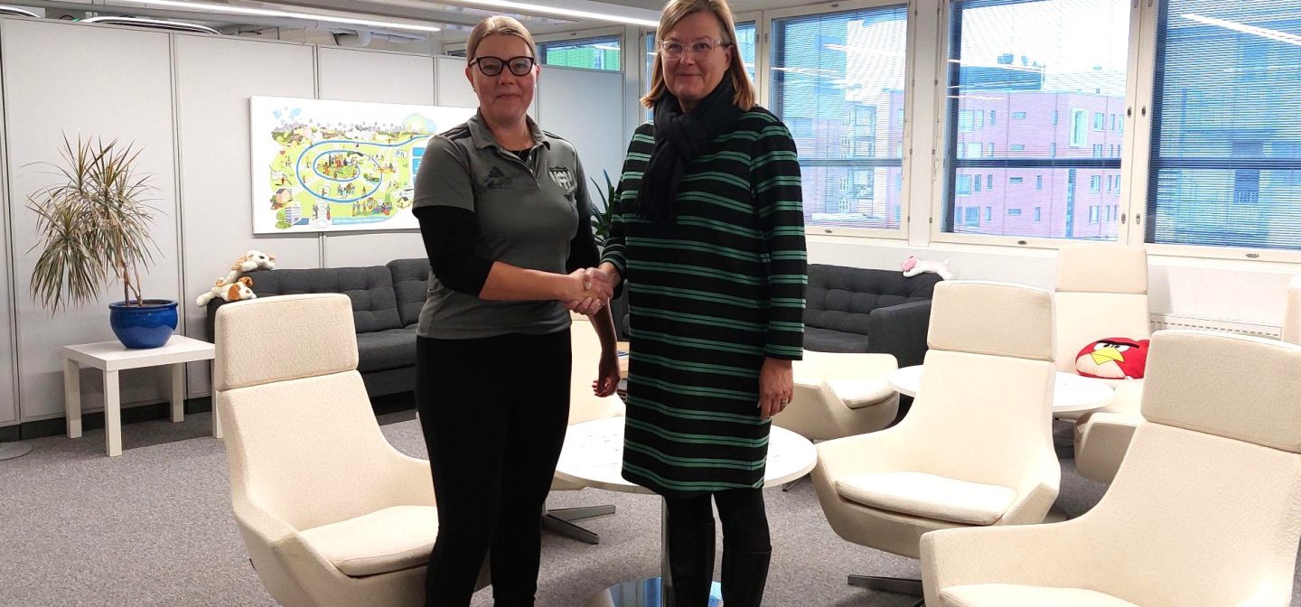 Kuvassa kättelevät Tikkurilan Palloseuran toiminnanjohtaja Tiina Vuorinen ja SOS-Lapsikylän toimitusjohtaja Mari Ahlström.
